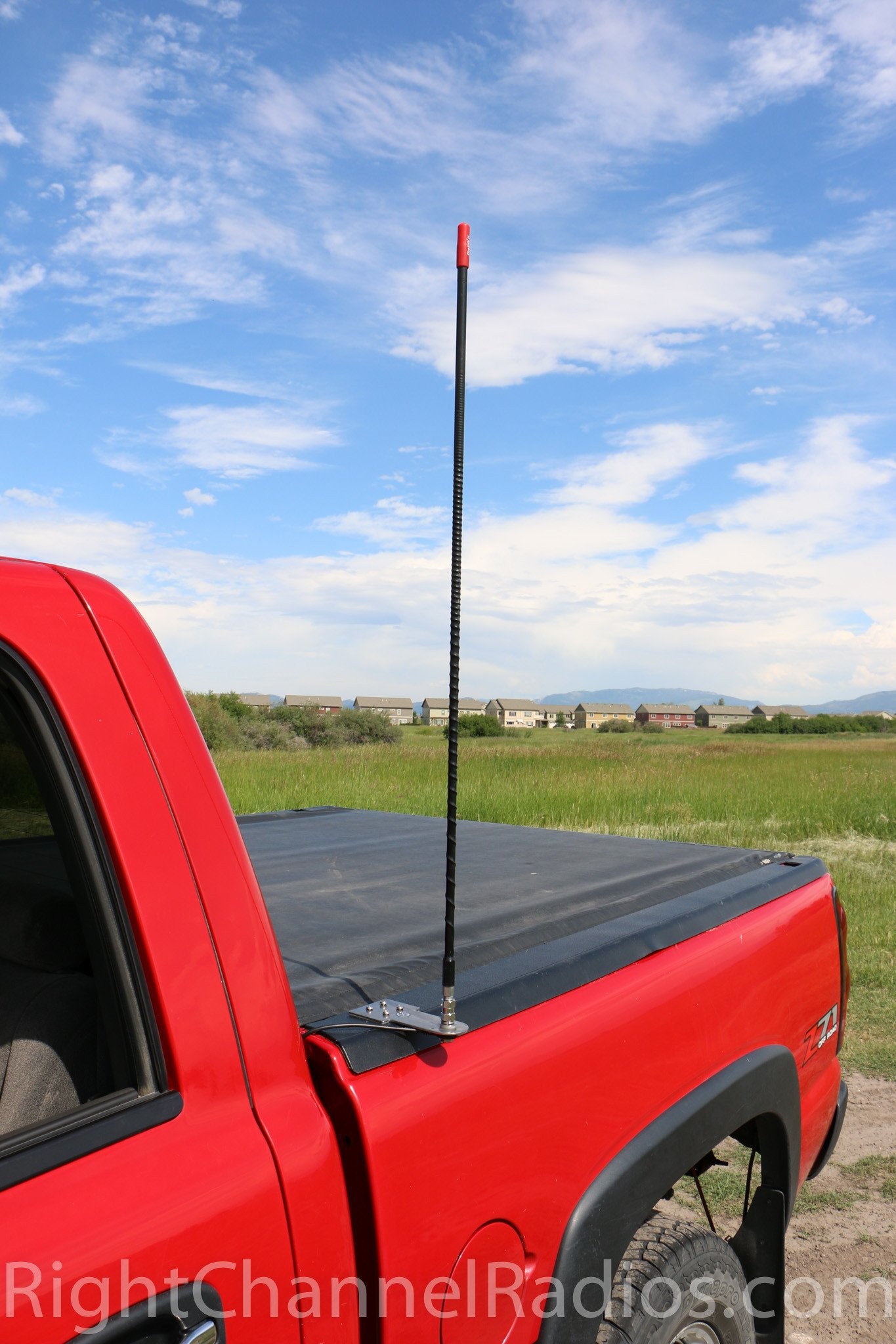 IMPORTANT: When mounted in either of the stake-hole pockets directly behind the vehicle cab, antennas under 4' will experience substantial reflection from the metallic corners of the cab (between the side and rear glass). As a result, shorter antennas will likely be difficult -- if not impossible -- to tune to a satisfactory SWR. For this reason, we recommend using an antenna longer than 4' with this mount.